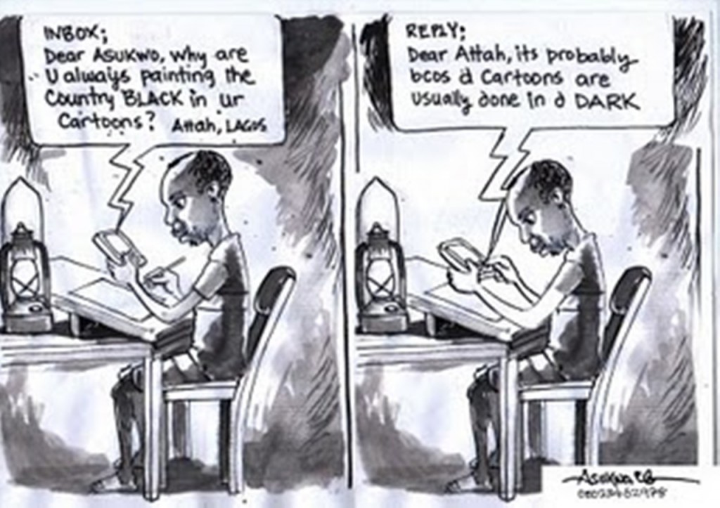 expression. Lately, the art curriculum has been overtaken by all kinds of borrowed courses. The art student has been made to begin to think of himself as less of an artist. Cartooning is not thought in school, I don’t know a school in Nigeria where it is offered, despite the fact that most people are living on it.