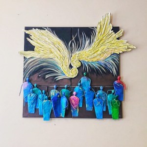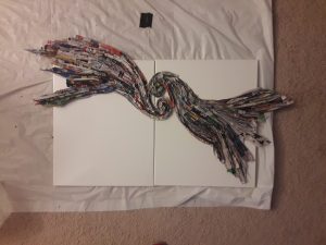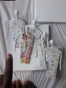 So, with better confidence and peace in myself, I set about creating my vision. I made about 17 figures from paper and wire using the papermache technique for all of them. As they would all share the same form, each would capture a different movement. This is to represent humanty basically.  While they dried, I worked on making swirls that represent the sun using newspaper for them. I wanted to get something close to the swirls you see in Van Gogh’s ‘Starry Night’ as he is an inspiration to me.