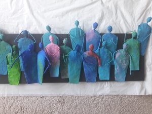 After painting all the canvases, the figures and the swirls, I finally arranged them. To add to their differences, I painted them in similar colors but each in a different way and arranged them in different hieghts across the 4 8″ by 10″ canvases. Then the swirls were placed on the bigger 16″by 20″ canvases as well. And finally, like a puzzle, they came together as my art piece.