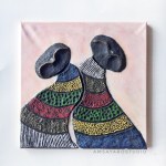 The first was of the masquerade forms bending over and into each other. After prepping and drawing my shapes on the canvas, I started layering the forms with my paperclay. I worked quickly over it so that it doesn’t dry out. I do spray water to keep it from drying but not too much as this tends to slow down adding details for me.
